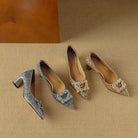 Design: Pointed toe with rhinestone buckle and shimmer finish